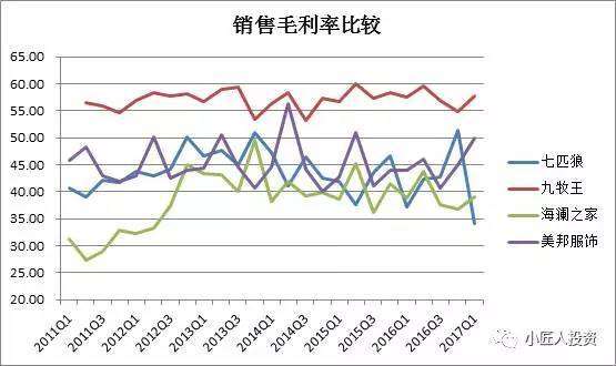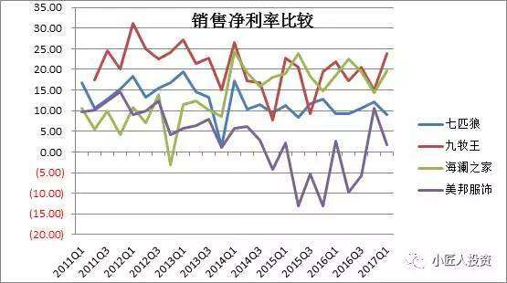从营业收入增速来看,自2011年以来行业增速持续下降,直到2013年底,四家公司开始呈现差异,海澜之家异军突起,快速发展,但只维持了一年左右随即掉头向下。从2017年一季度情况来看,美邦的营收还在下滑,海澜之家保持持平,只有七匹狼和九牧王出现转好迹象,营收开始恢复正增长,但是增长幅度也仅是个位数。