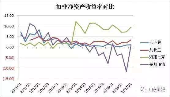 从扣非净资产收益率来看,从2014年开始,海澜之家的净资产收益率远远高于另外三家公司(具体原因后续分析中可见端倪),九牧王和七匹狼较为稳定,美邦服饰波动较大。