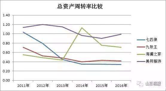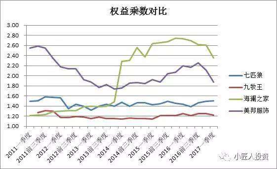 从权益乘数,也就是财务杠杆来看,海澜之家最高,美邦服饰其次,九牧王和七匹狼较低。这也一定程度上解释了海澜之家较高的净资产收益率。