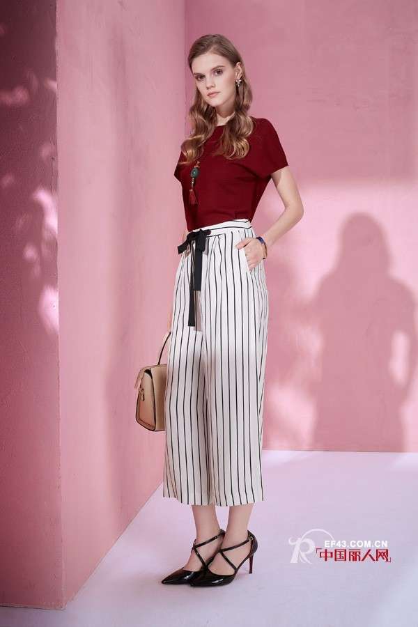 都市白领女性应该怎么穿衣,看迪图就知道了。酒红色高贵优雅,配上时尚感十足的黑白条纹阔腿裤,两种色系的碰撞立刻引发出强烈的优雅知性范,再配上一条黑色细高跟,气场立刻就出来了有没有。