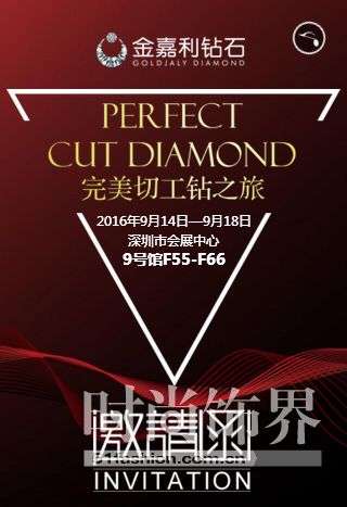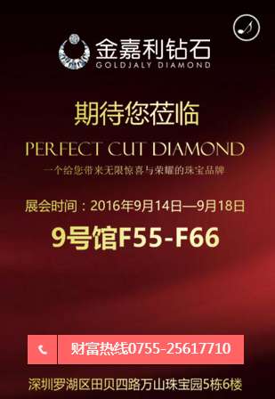 2016年倍受期待的深圳国际珠宝展将于9月14日—18日在深圳会展中心拉开帷幕,金嘉利钻石将携大量完美钻饰新品、精品全新亮相深圳国际珠宝展会,为广大与会客商带来一场璀璨的珠宝盛宴!金嘉利钻石展位号:9F55-66