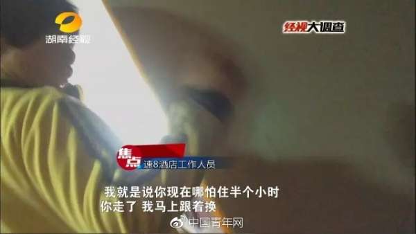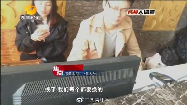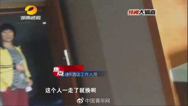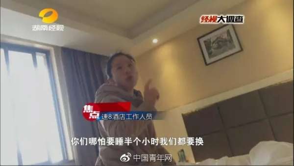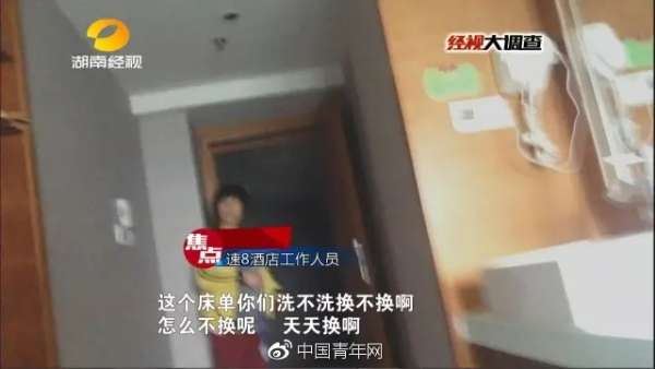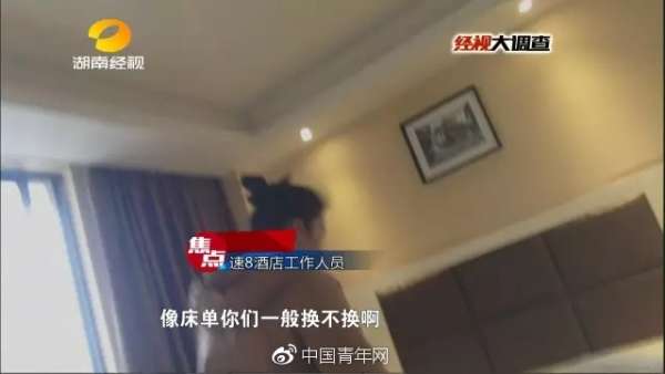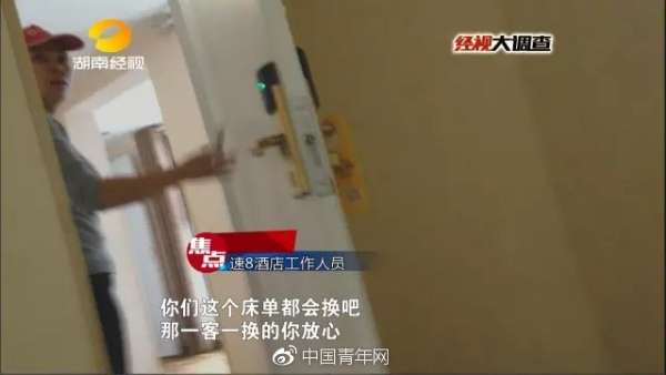就这样,客人使用过的床上用品再次让下一位顾客使用。事实清楚,证据确凿。记者再次找到速8酒店前台,对酒店没有更换床上用品提出质疑。