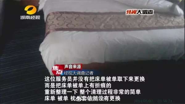 如果你以为床单上有折痕,就是换洗过,那么小编要告诉你错了,这折痕只是员工故意蒙骗顾客的假象。作为一家大型的连锁酒店,把客人睡过的床单、被单、枕头套重复使用,欺骗消费者的,还有速8酒店长沙东风路店!