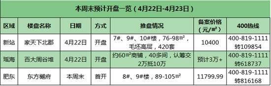 本周末(4月22日-23日)是“银四”月第三个周末,据腾讯房产合肥站不完全统计,在4月22日-23日两天内,合肥楼市预计有3家楼盘推出新品,房源业态主要是高层和商铺,其中新站的家天下(资料 图库 动态 价格 论坛)北郡一次性释放420套房源,对于想在市区置业的刚需群体来说是个不错的选择。