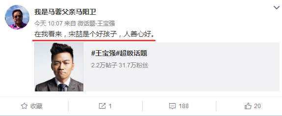继马蓉小号在网上怼王宝强后,马蓉父亲也注册了一个小号,开始煽风点火。5月23日早上10点7分,微博用户我是马蓉父亲马阳卫发布消息说:在我看来,宋喆是个好孩子,人善心好。
