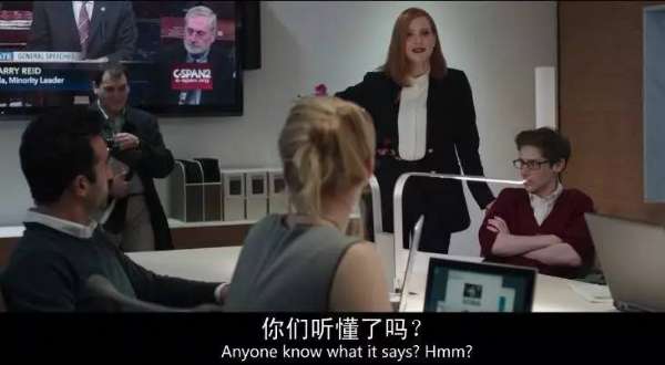 作为华盛顿政府外包事务交流公司的头牌,斯隆成天和国会山的参议员们打交道。在一间小黑屋里聆听他们的政治主张,再拼了命去落实他们的主张。