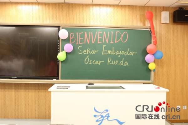 国际在线报道(中国国际广播电台记者 杨喆):5月31日,哥伦比亚大使奥斯卡?鲁埃达应邀来到北京古城中学,为古城中学西班牙语班的学生带来了一场生动的哥伦比亚文化盛宴。为了迎接大使的到来,同学们用气球和哥伦比亚国旗布置会场,身着哥伦比亚巴兰基亚地区的传统服饰,挥舞起手中的哥伦比亚国旗对大使表示热烈欢迎。
