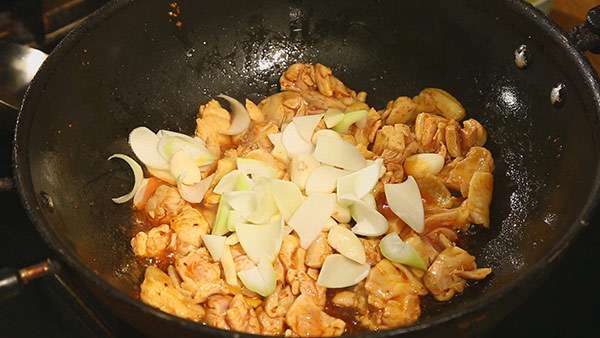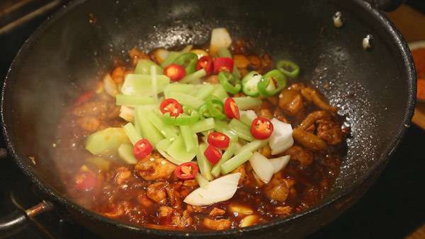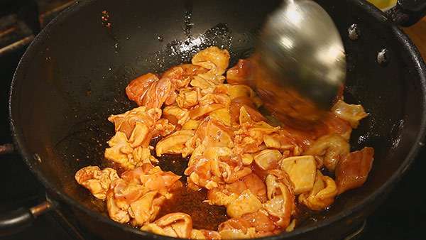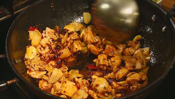 4.辣椒油混合花椒油炒制鸡肉。