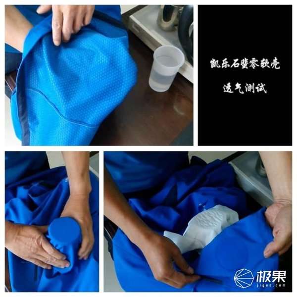 以下是采用蒸汽法做出的测试。首先在杯子中倒上热水,把软壳衣的面料蒙在杯口上,也可以在面料上再压一块玻璃,如果看见热气透过面料冒出来,或玻璃上凝结了水气,那就说明面料是透气的。由于面料的透气率是不同的,有高有底,测试仪器的精度等方面。下面试验只能证明面料不是完全不透气,但透气性能的好坏还是不知道,仅供参考。