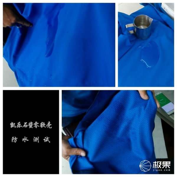 因这几次户外没遇上下雨,所以也不知道这件衣服真正的防泼水性能,所以采用瓶装水喷洒进行测试。