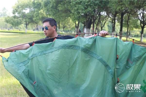 把帐篷均匀的穿在支架杆上。再换另一根支架杆。