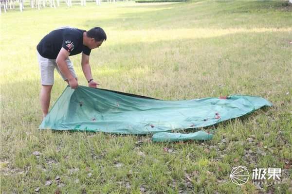 展开帐篷 平铺在草地上,根据安装说明,找到安装方式。