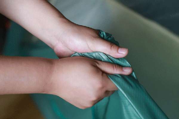 从收纳袋出抽出帐篷、支架杆