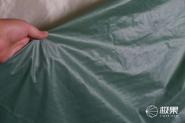 住帐篷面料上泼上水,水很顺顺着面料下滑,表面上只有少许水珠。翻开面料另一面,完全没有水渗透现象。
