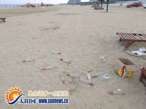 这片沙滩上有不少随意丢弃的烧烤串签、啤酒瓶、塑料袋等