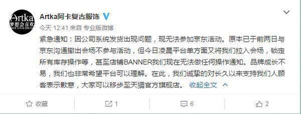 但也并不是所有的商家态度都很模糊,Artka阿卡复古服饰官微发布微博称,6月6日凌晨京东单方面将其拉入会场,锁定所有库存操作等,甚至店铺BANNER也无法做任何操作通知。其同时建议消费者移步天猫官方旗舰店。