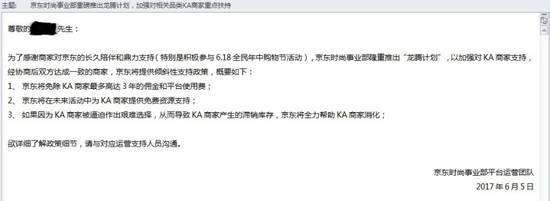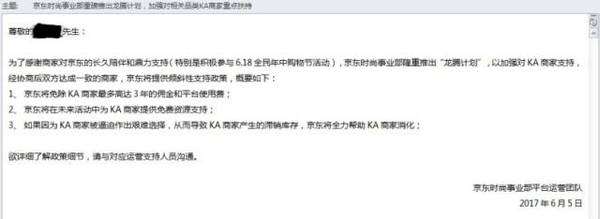 内容包括:为长期鼎力支持京东的商家提供,第一、免除KA商家最多高达3年的佣金和平台使用费;第二、在未来活动中为KA商家提供免费资源支持;第三,如果因为KA商家被逼迫作出艰难选择,从而导致KA商家产生的滞销库存,京东将全力帮助KA商家消化。