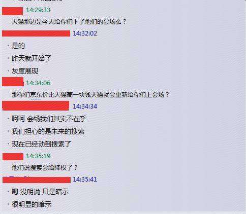 据部分商家透露,天猫小二已经逐个给商家打电话,让他们做出两个选择,要么将京东会场的所有商品下架,要么商家自己将京东会场上的商品拍下架。