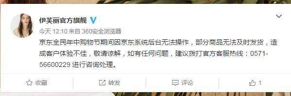 伊芙丽相关负责人表示,由于京东系统原因,导致伊芙丽官方旗舰店库存及页面无法修改,影响了用户体验。但对于上述媒体中所提到的关于伊芙丽的信息,他目前也不知道怎么回事,伊芙丽方面正要跟该媒体沟通相关事宜。