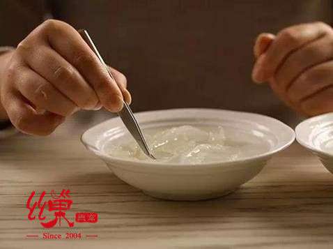 3、挑毛:待燕窝完全膨胀后,用镊子进行挑毛与去杂质,这里需要极度的耐心与细心。挑毛的过程中应注意不要将燕条破坏,这样炖煮出来的燕窝口感会更佳;