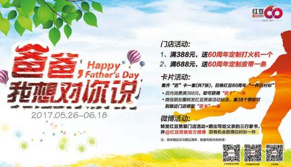 正值红豆60周年,红豆男装精心准备了一系列周年定制礼物回馈新老顾客。5月26日-6月18日父亲节活动期间,红豆男装在全国正价门店开展父亲节满送活动:购买388元,送60周年定制打火机一个;购买688元,送60周年定制皮带一条。