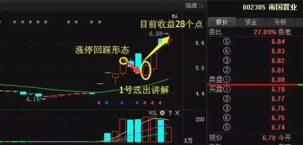 可以看到南国置业讲解第二天是直接涨停,并且在今天继续走高,截止目前收益28个点。这就是“涨停回踩双线”选股法所能抓住的机会。很多股友当时是看到了选股文章,并且懂了这种选股法,是不是同样抓住了一波。