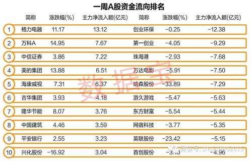从一周资金流向来看,白马股仍是主力资金集中大幅杀入的标的。数据宝统计显示,格力电器一周主力资金净流入13.12亿元居首,一周股价上涨11.17%;万科A一周主力资金净流入7.67亿元,股价大涨14.95%;中信证券(行情600030,诊股)一周主力资金净流入7.22亿元,股价大涨3.86%。此外,美的集团、海康威视、中国建筑(行情601668,诊股)、平安银行(行情000001,诊股)等白马股一周主力资金净流入均超过3亿元。