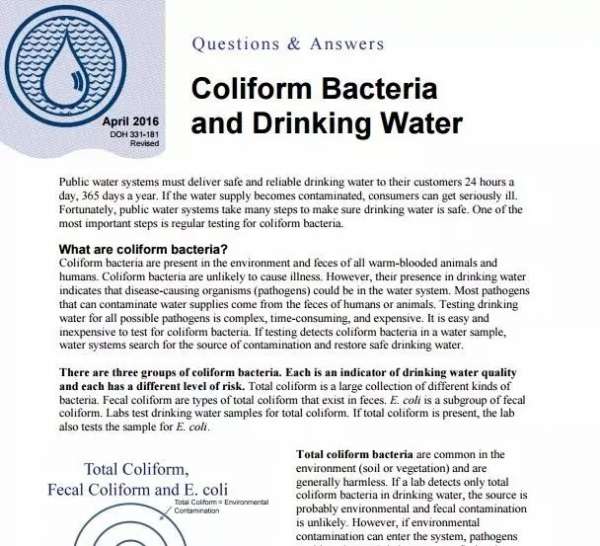 \u00A0\u00A0\u00A0\u00A0华盛顿州卫生局报告显示,粪大肠菌群通常被作为水质状况的“晴雨表”。如果饮用水源中被检测出含有粪大肠菌群,通常意味着水质恶劣,可能含有其他病菌,需要卫生局立刻展开全面调查。