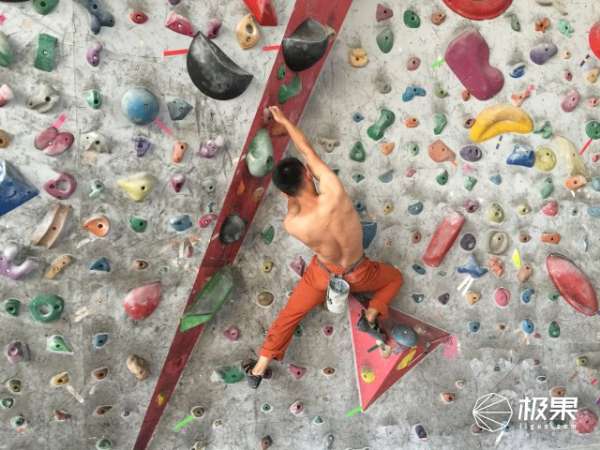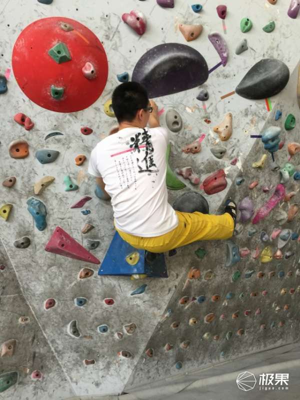 旧旧的9A上面有着镁粉的痕迹,配着抱石墙的背景,加上棱角分明的上身肌肉,很有范儿!