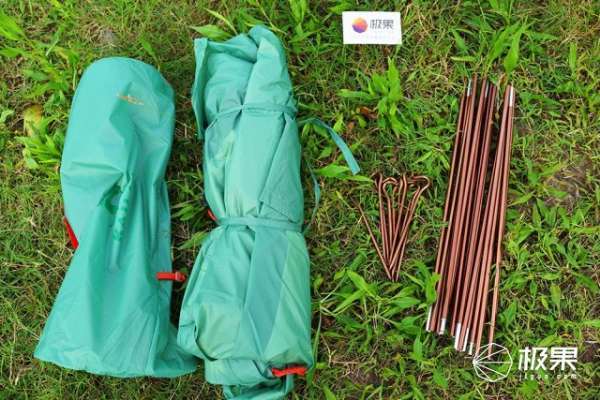 这就是这套帐篷所有的物件,除了本体之外,主要包括帐竿和地钉,而且这些配件都分别有和帐篷同材质的袋子进行存放。