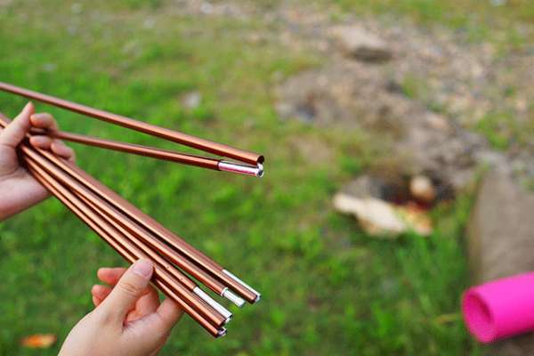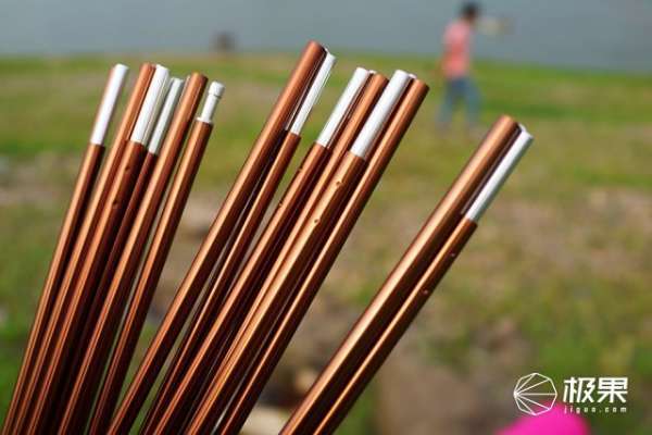 帐竿有两根,为空心的铝合金材质,咖啡色很好看,重量也很轻,和大多数的帐篷一样,它也是采用可折叠设计,内部用弹力绳进行连接,使用时把临近的两节绷直,再合拢即可,操作起来非常快捷。