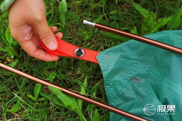 搭建的第一步,就是将帐竿按对角线的方式插进帐篷底部角上的孔位中,这也是最基础的支撑。这里可以看到在受力的部位帐篷的走线是非常细密的,可以有效防止因为受力造成的脱线。