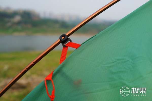 凯乐石天穹四季帐的外袋上设计了可以收紧的绑带,而且提供了横竖两种提手,方便携带。