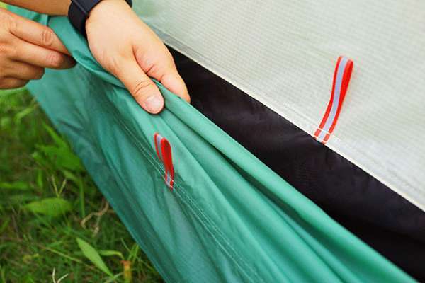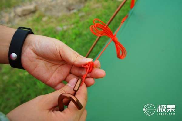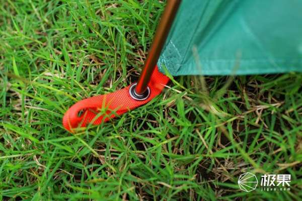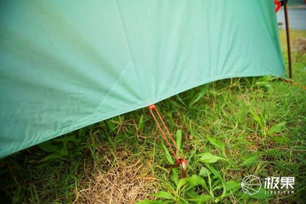 在帐篷的边上、角上都设计了用来固定地钉的绳孔,这里需要注意的是,地钉不能垂直插入地面,需要向外侧倾斜45-60度,尽量插深一些,这样才能起到真正的拉伸固定作用。