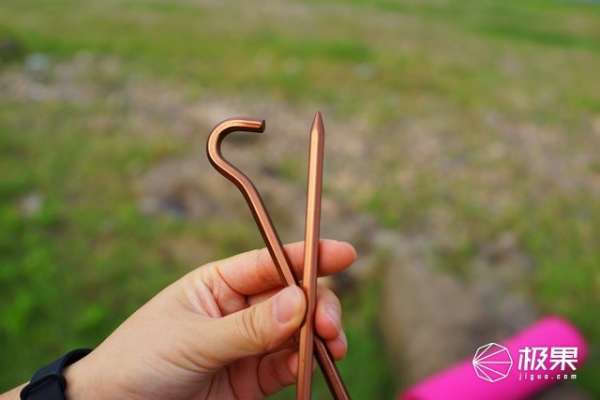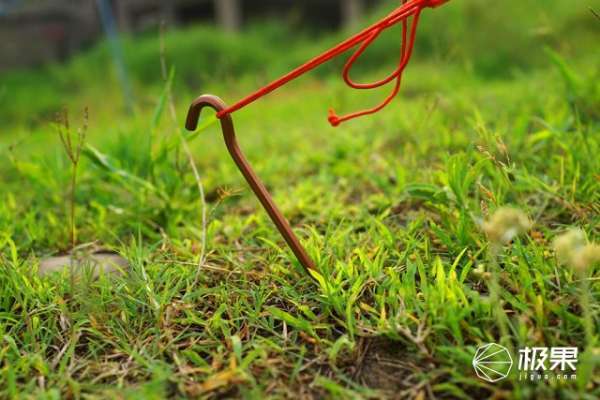 接下来需要做的就是利用地钉进行加固,如果只是日常休闲用这一步可以省去,不过在户外露营的话这就必不可少了,凯乐石一共配备了10根这样的地钉,和帐竿一样是采用的铝合金材质。