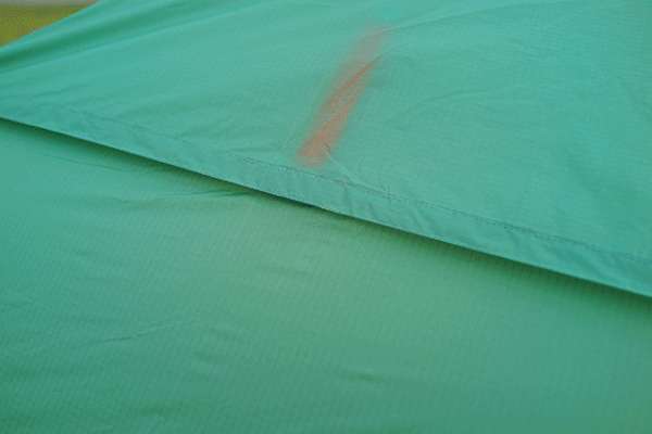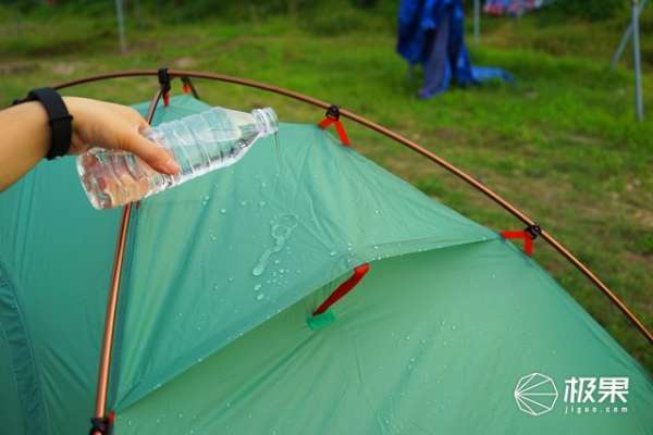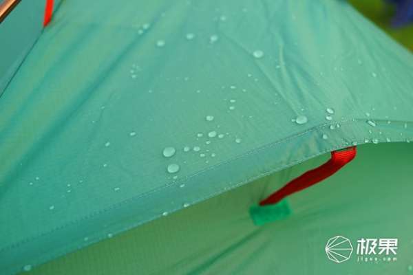对于户外帐篷来说,防风防水是必备的特性,没有遇上雨天,我自己测试了一下防水性能,把一瓶水直接倒向帐篷表面,可以看到会立即凝聚成水珠,并往下滑落,即使停留在表面的水珠也没有丝毫浸入的迹象,只要轻轻抖动帐篷,也能迅速流走。