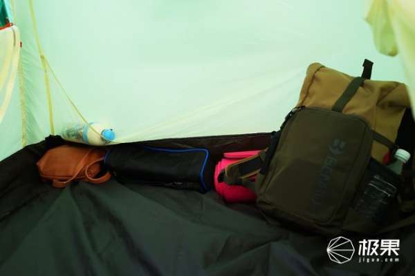帐篷内部的空间除了睡人之外,还可以放置背包之类的随身物品,面积是足够的,不会显得局促。帐篷的底部采用的是75D的尼龙布,相比其他部分的材质,它的防水性能会更好。