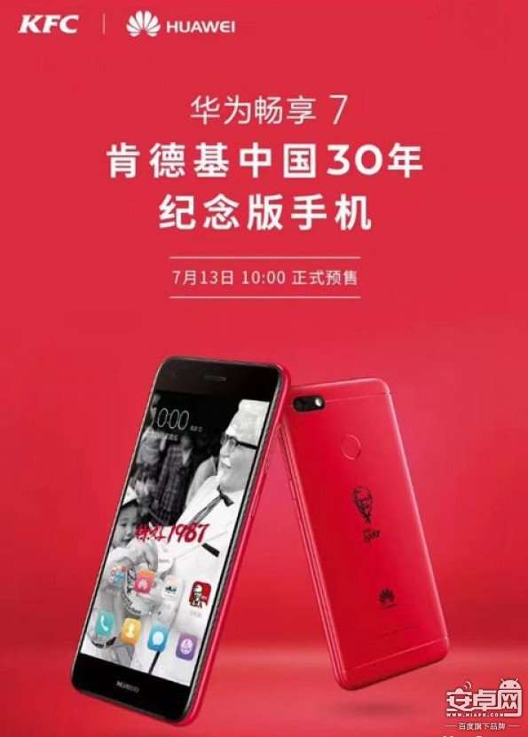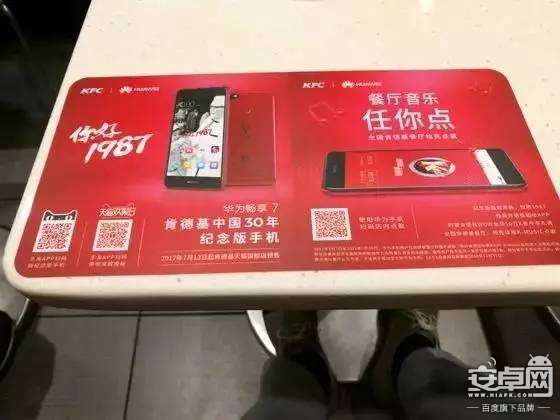 有微博网友曝光了一张疑似在肯德基餐厅拍到的宣传彩页,从图中来看,华为将和肯德基联手推出“肯德基中国30周年纪念版”畅享7手机。