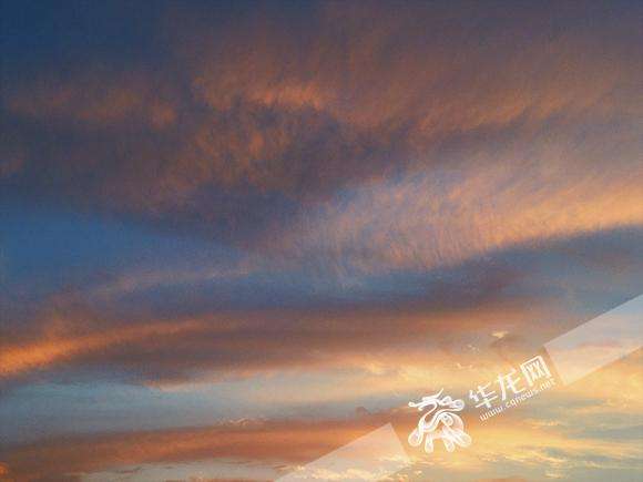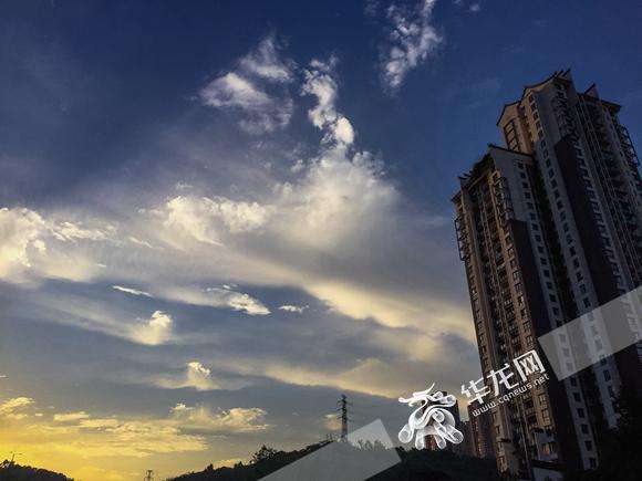 19时40分,随着夕阳西下,重庆原本蔚蓝的天空换上了一套鎏金的衣裳,白色的云朵则被金色的阳光照得透亮透亮。