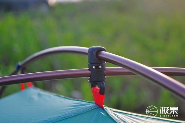 帐底四角扣眼与帐杆四眼相扣,并且利用凯乐石专利扣件,环环相扣支撑起了整个帐篷,这款帐篷可以说最大亮点就是外挂帐杆,凯乐石巧妙的把内帐传统挂式移植外帐上,让搭建更加便捷,并且解决了雨天搭建打湿账内及装备弊端,让雨季露营更加干爽安全。