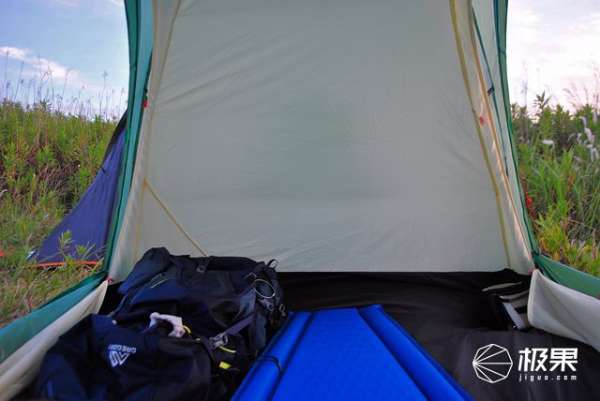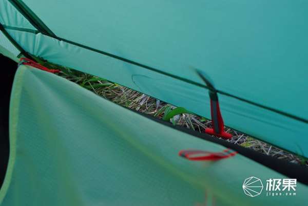 双门设计能提供视野更加宽广的范围,营地选择上视角更加通透,帐门设计也略显死板,双侧拉锁属于标配模式,外帐下侧收纳帐门设计我认为是一败笔,或者说两侧都采用底部收纳方式,雨天开启帐门上部没有任何遮挡,出入间隙雨水直接落到帐篷内部。
