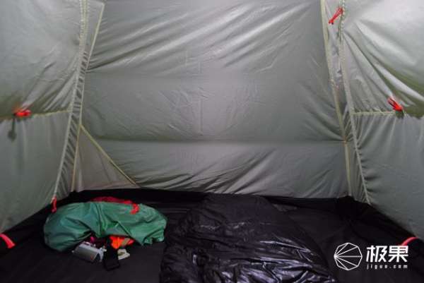 凯乐石天穹帐篷在空间布局上,新意不多,双门双层帐设计,210mm的长度满足大部分身高需求,140mm宽度定位于双人帐如果考量装备的放置略显拥挤。110mm高度空间对于我170公分身高来说绰绰有余,整体接近1.58平方米的空间缺少门厅设计是最大遗憾。