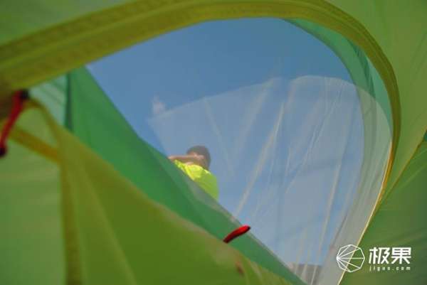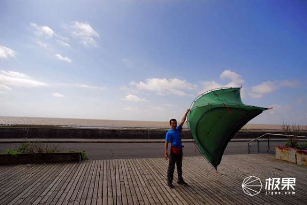 为了更加形象的表达风力情况,单手握住帐顶扣件,风力可以轻松吹起帐篷,迎风飘展图片侧面也能表达出,这款帐篷出色的设计及裁剪功力,风力影响下,帐杆没有任何脱扣变形情况产生。