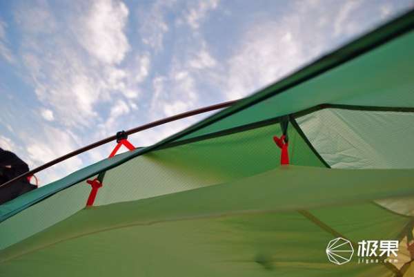 外帐对流窗口设计,在我看来是帐顶空气流通保障,而一款设计优良的帐篷,整体空气流通才能保障居住舒适性,凯乐石天穹在外帐设计上满足这点需求,在帐篷搭建饱满情况下外帐与地面留有一定间隙,满足了空气流通条件,并且与顶部气孔形成一个空气循环小气候,有效的满足了帐篷与外部空气流通互换。而内帐设计澡盆高度大于内外帐距离与外帐距地面高度之和。避免雨水滴溅打湿内帐。