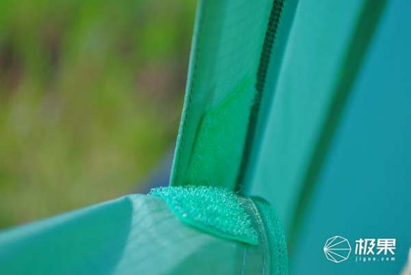 为了对应内帐纱网通风性,外帐帐门在中间位置使用粘扣固定,可以调整帐门打开角度,在炎热环境下,加大帐篷内部空气流通。