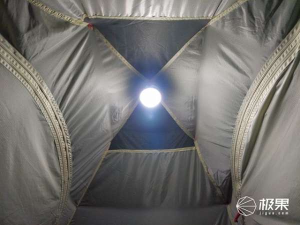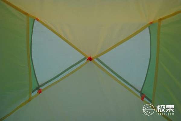 内帐无遮盖纱网设计在顶部位置,热量积聚通常都会从顶部快速扩散开,正好也可以通过对流外帐透气口排出。露营灯挂点也设计在顶部位置。