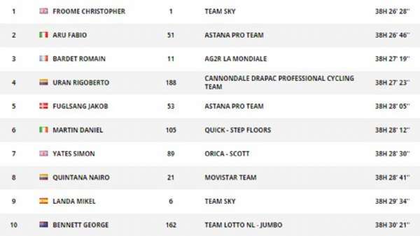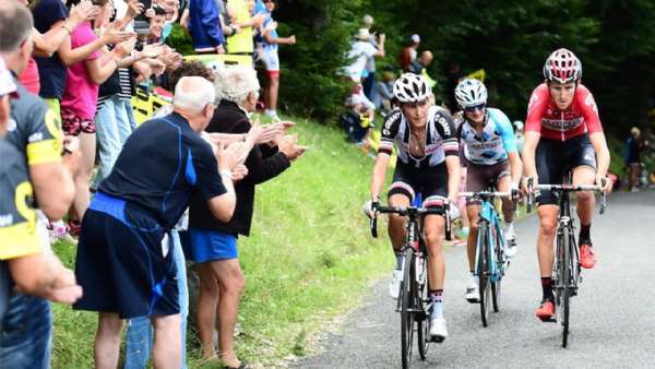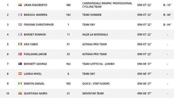 弗鲁姆、波特、巴代、金塔纳、乌兰、阿鲁、丹·马丁七人形成最终GC集团,几度拉扯过后金塔纳掉队。弗鲁姆一波加速追上了早先进攻的福格尔桑,此时猫墙爬坡即将结束。主车群前方此刻只有昨天参与突围的巴吉尔一人,手握15秒领先优势进入最后26公里。