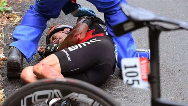 猫墙下坡,赛前大热BMC里奇·波特时速72.5公里不幸空翻摔车,丹·马丁被波及。当时地上有大量血迹被紧急送往医院,最新消息是颈部并未骨折但有脑震荡,愿大魔王早日康复重返赛场。