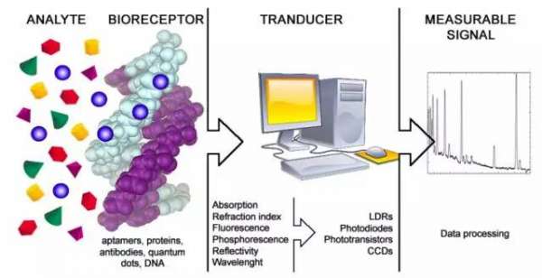 △生物传感器:由接收器和转化器构成,