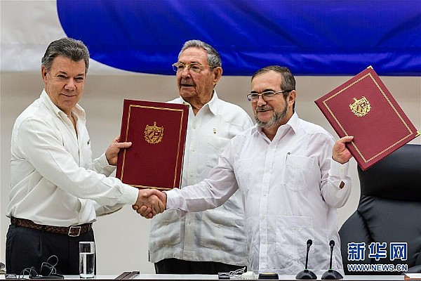 \u00A0\u00A0\u00A0\u00A0\u00A0\u00A0 2015年9月23日,在古巴领导人劳尔·卡斯特罗的见证下,哥总统桑托斯和“哥武”领导人罗德里格·隆多尼奥·埃切韦里在哈瓦那签署有关和谈的决定性协议,规定双方在2016年3月23日前签署和谈最终协议,而“哥武”将在最终协议签署后两个月内彻底放下武器,哥伦比亚和谈取得突破性进展。